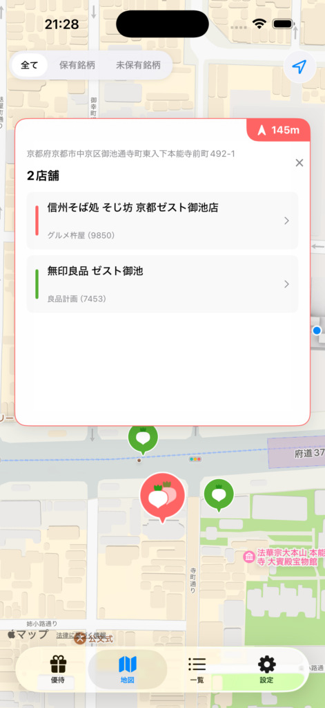 もちろん、2つのカブマークも「そこにお店がある」という意味では間違いないのですが、同じ住所に複数の店舗が入居している(いわゆるモールやテナントビルなどの)場合に、2つのカブマークが表示されます。