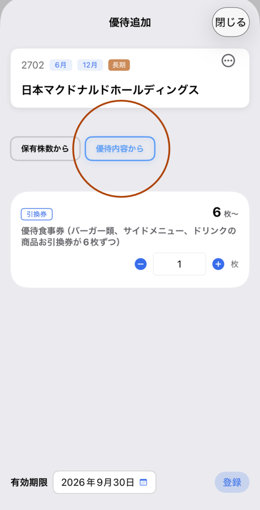 すでに利用をされている株主優待で、残りの数や金額を登録されるときは、登録の際に「優待内容から」のタブを押していただくと、提供される優待の枚数や金額、ポイント数などを細かく調整して登録することができます。